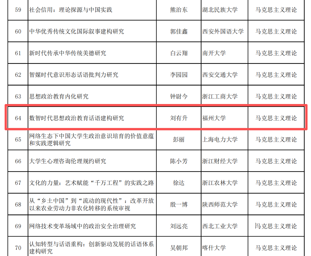 2025年12月23日,全国哲学社会科学工作办公室发布了2025年国家社会科学基金后期资助项目立项名单,我院刘有升教授申报的《数智时代思想政治教育话语建构研究》项目获批,这是其近年来获得的第二个国家社会科学基金项目。